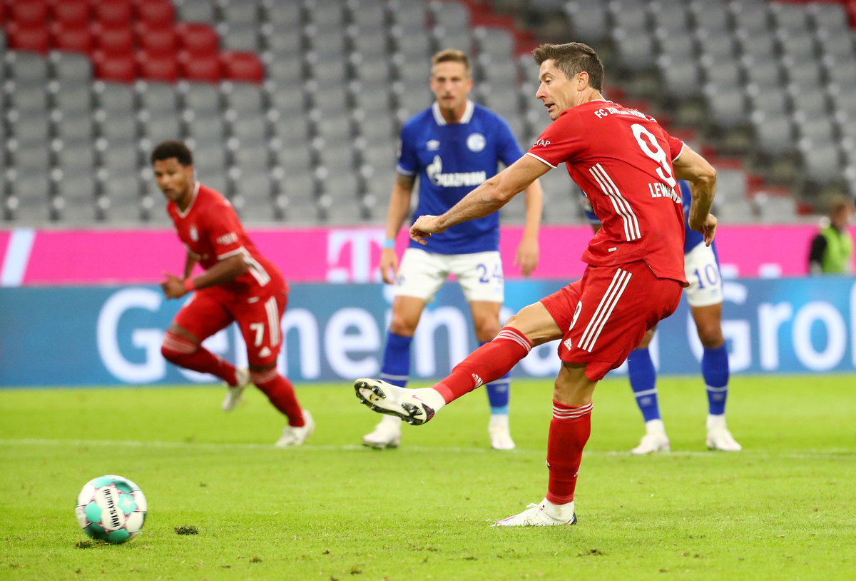 Last season's top scorer Robert Lewandowski found the net with a 31st-minute penalty to become the first player to score in 10 successive appearances against the same Bundesliga opponents.