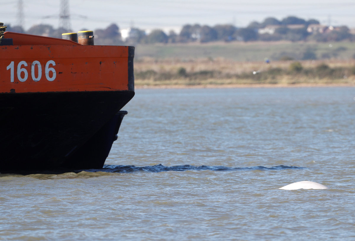 The white cetacean, which feeds on fish, squid and crabs, was first spotted on Tuesday and surfaced near Gravesend, Kent on the southern side of the estuary, television footage showed.