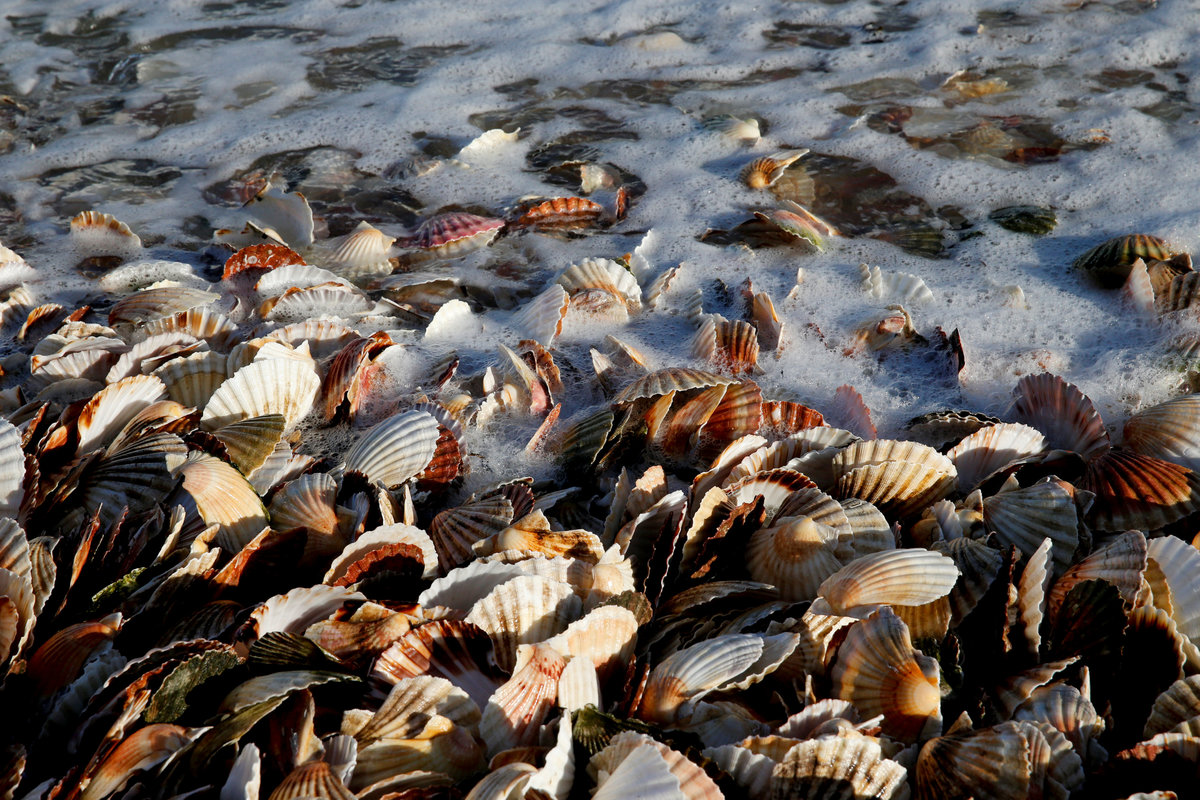 At noon, fishermen dropped their dredges. The dragnets scrape the bottom of the bay for 15 to 20 minutes before being pulled up full of large pale shells.