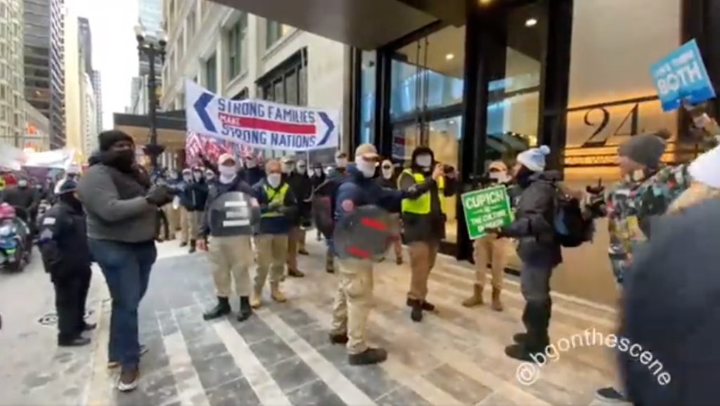 Dozens of men from the white nationalist group, dressed in their trademark khakis and masks, were caught on video amassing near the anti-abortion March for Life protest on Saturday. They appeared to be offering their support, carrying shields, upside-down American flags, and a banner reading “Strong Families Make Strong Nations.”