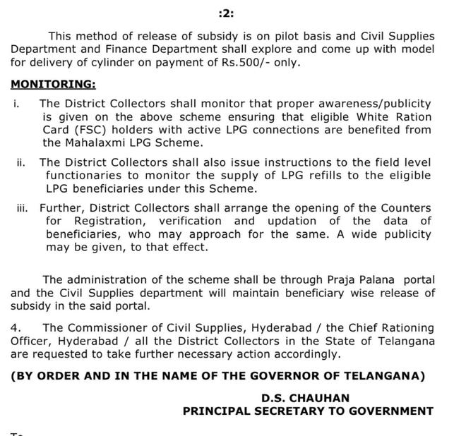The district collectors had been asked to monitor that proper awareness/publicity was given ensuring that eligible white ration card holders with active LPG connections benefit from the Mahalakshmi LPG scheme. The district collectors should also issue instructions to the field level functionaries to monitor the supply of refills to eligible beneficiaries besides making arrangements for opening counters for registration, verification and updation of the data of beneficiaries who might approach them to avail the benefit.