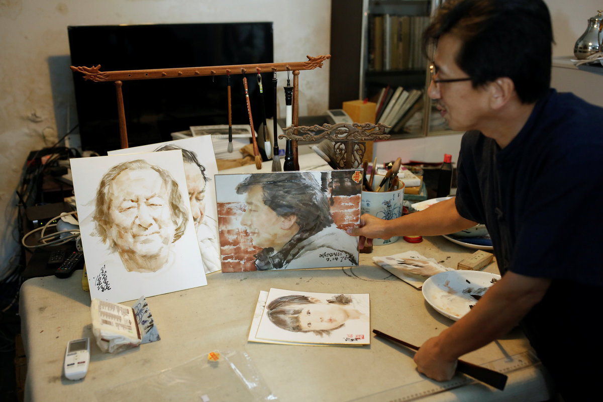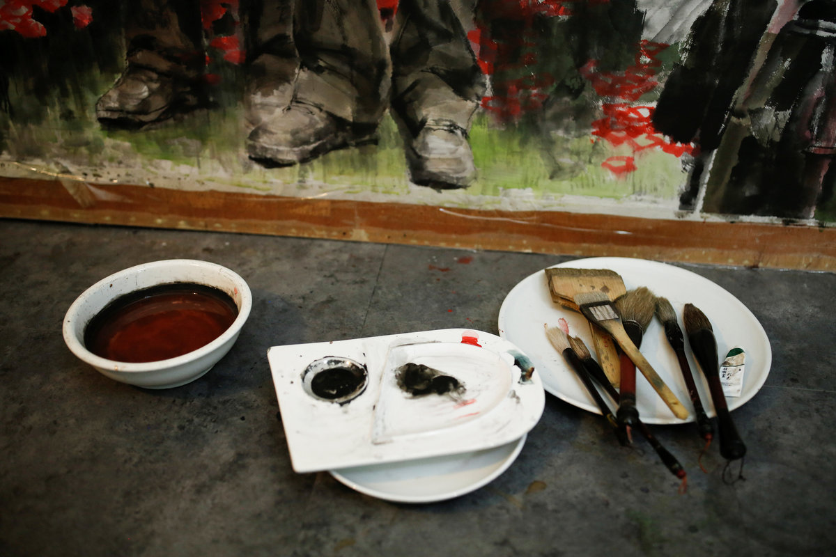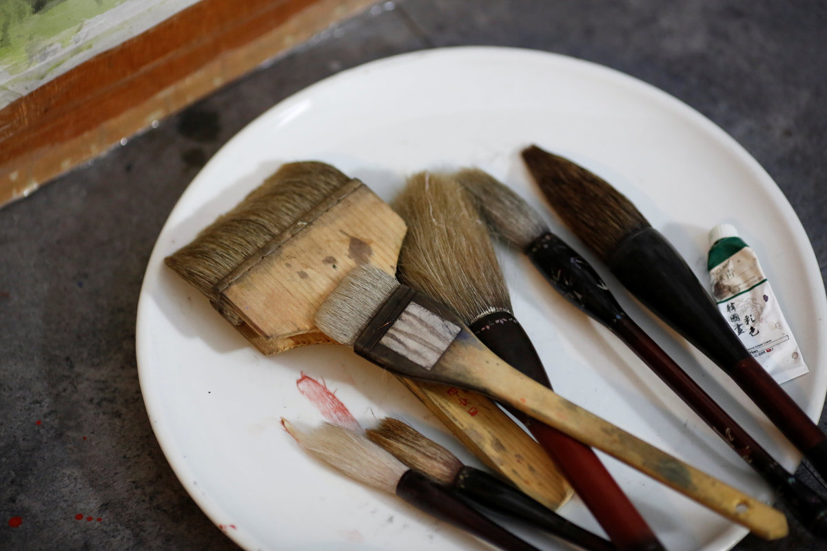 DANDONG, China (Reuters) - Seated beneath tall windows and dressed simply in singlets and trousers, North Korean painters are hard at work. The artists staple canvases to frames or copy idyllic landscapes from laptop computers. One wears headphones as he brushes a group of running horses onto his canvas.