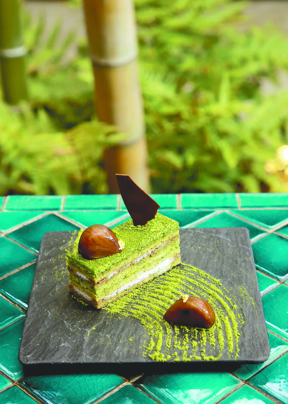 Such a karensansui garden is re-created on a plate at Salon de Kanbayashi, a cafe in the Higashiyama area. Its matcha green tea opera cake (850 yen) sits like a mountain on the plate while a flowing river is expressed with green tea powder from Kanbayashi Shunso Honten, a long-established matcha manufacturer based in Uji, Kyoto Prefecture. Amid the stream is a rock symbolized by a sweetened chestnut.