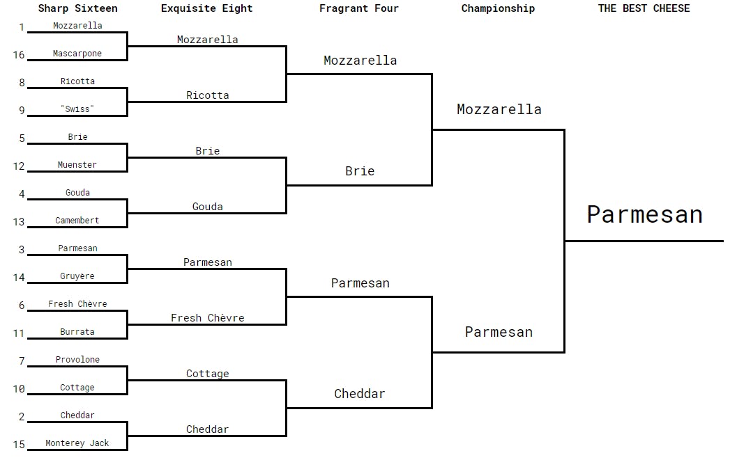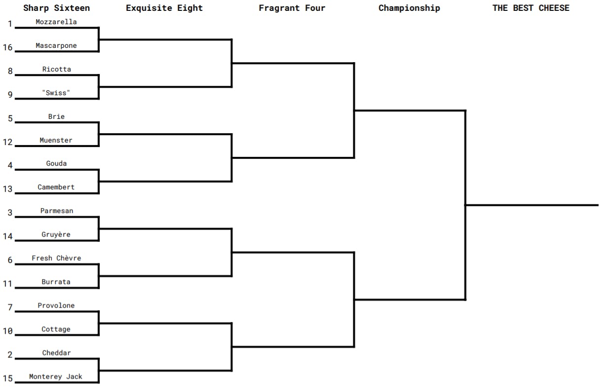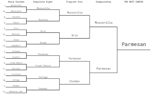 Sadly, cottage cheese’s upset was a one-round-only showing, as No. 2 seed cheddar marched easily onward. (“[Cheddar] is Duke here,” one participant noted. “It’s No. 2.”) Cheddar and parmesan were ultimately joined by Brie, which dominated over Gouda based on its relative decadence alone, and mozzarella, which at this point was still mostly riding on its association with pizza.