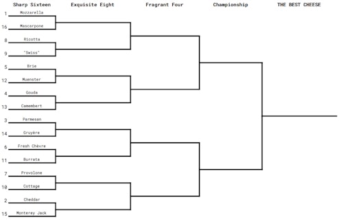 Most of the first round proceeded as expected, with decisive wins for higher-seeded mozzarella, ricotta, Brie, Gouda, parmesan, fresh chèvre, and cheddar over lower-seeded mascarpone, “Swiss” (which again, is not really a type of cheese!), Muenster, Camembert, Gruyère, burrata, and Monterey Jack, respectively.