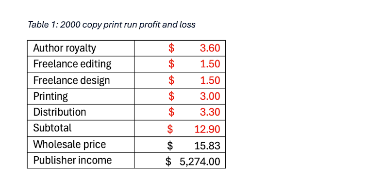 If a publisher sells 80% of the print run, the income would be $5,274. With their income, a publisher pays for overheads such as salaries, rent, insurance, purchases, software and hardware. They will also pay tax.