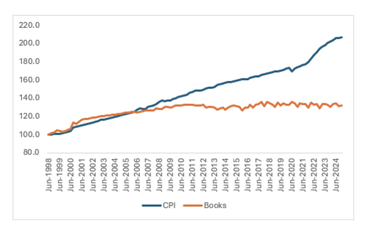 In the late 1990s, when the Australian Bureau of Statistics started collecting data on book prices, they seemed to be rising in line with the consumer price index (CPI). Since the early 2000s, the CPI has jumped, while books have hovered around the same price.