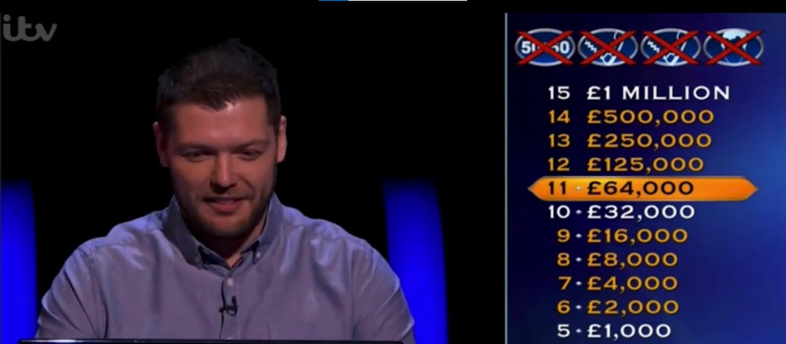 What a guess! Well done Glen! That’s £64,000 and a shot at £125,000 👏👏👏 #WhoWantsToBeAMillionaire pic.twitter.com/2sM4DsRwqU