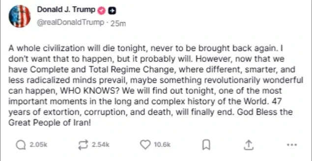 "A whole civilization will die tonight, never to be brought back again. I don’t want that to happen, but it probably will. However, now that we have Complete and Total Regime Change, where different, smarter, and less radicalized minds prevail, maybe something revolutionarily wonderful can happen, WHO KNOWS?" said the US president on Truth Social.