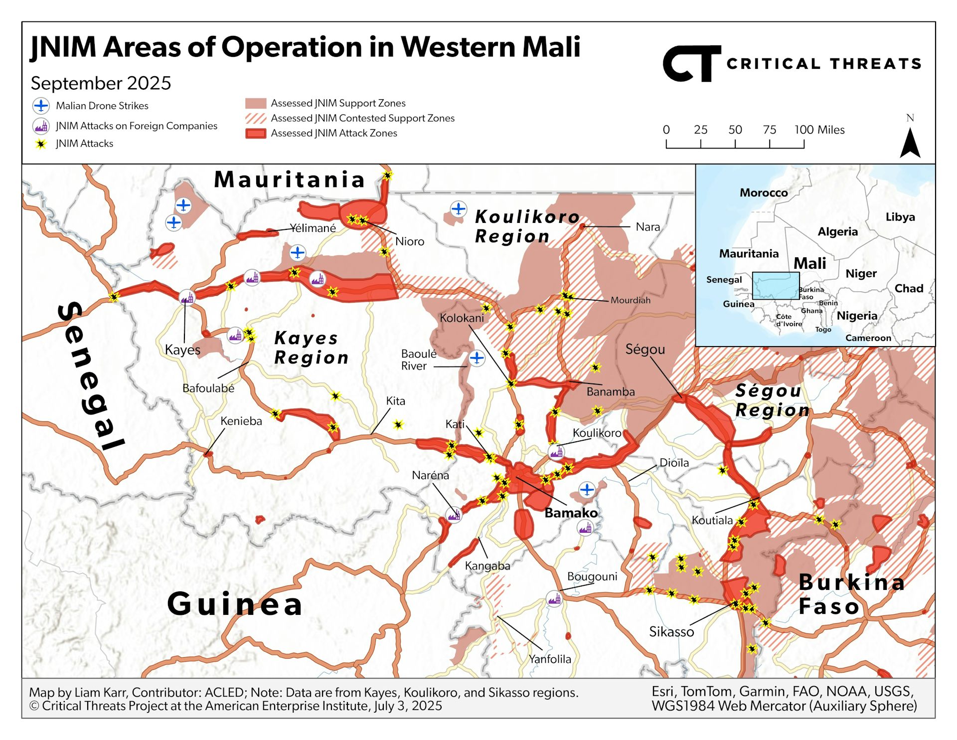 The group has seized army infrastructure, carried out strikes on convoys of fuel tankers, and assaulted foreign-owned factories and mines. It has also kidnapped foreign nationals for ransom. Some experts anticipate that the group may soon start a full siege on the Malian capital, Bamako.