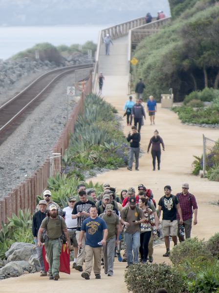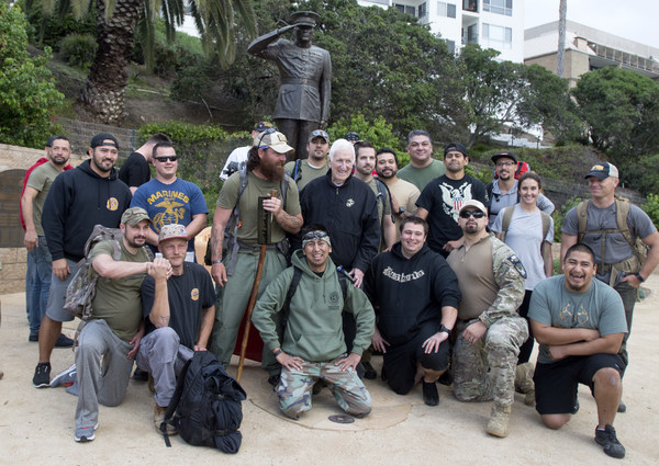 The group walked San Clemente's beach trail from North Beach to Park Semper Fi to pose for pictures in front of San Clemente's Marine Monument. Wayne Eggleston, creator of Park Semper Fi, was there to welcome them.