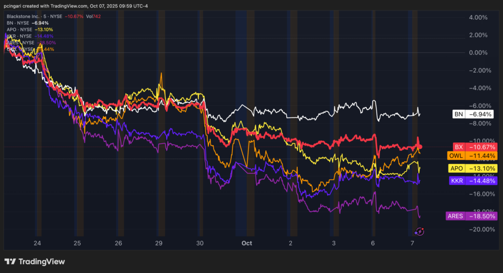 Despite the rate cut from the Federal Reserve and record equity valuations, private equity giants such as Blackstone Inc. (NYSE:BX), Apollo Global Management Inc. (NYSE:APO) and KKR & Co. Inc. (NYSE:KKR) have dropped more than 10% in less than two weeks.