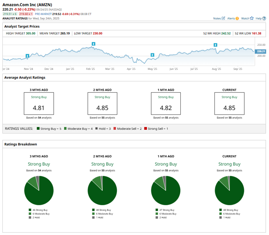 The average analyst price target for AMZN is $266.65, indicating potential upside of 22%. The Street-high target price of $305 suggests that the stock could rally as much as 39% from here.
