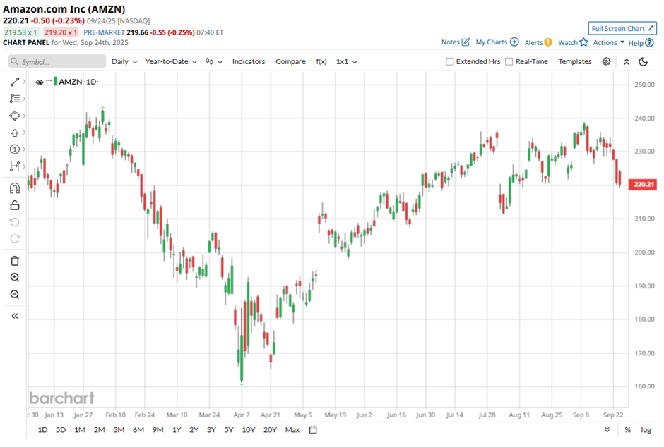 Over the past year, AMZN stock has delivered a muted performance relative to its Big Tech peers, down less than 1% year-to-date (YTD), making it among the weakest performers in the “Magnificent Seven.” The stock has delivered 17% returns over the past 52 weeks.