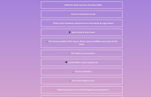 Moran has been investigating the spread of conspiracies and antivax sentiment and began focusing on Linktree when she recognized its central role. “We can’t get a handle on it because we don’t know how many people these accounts represent in the grand scheme of Linktree,” says Moran. One single Linktree page Moran found contains “information” about the contents of Hunter Biden’s laptop, “the Universe, NASA, UFO’s, Space, Aliens, Clones, DUMBS, Inner Earth & Flat Earth,” and a theory tying the sinking of the Titanic to MKUltra, a CIA program.