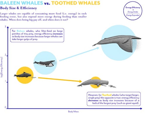 Because of a lack of large enough prey, we found that toothed whales energetic efficiency decreases with body size the opposite of the pattern we documented for baleen whales. Therefore, we think the ecological limits imposed by a lack of giant squid prey prevented toothed whales from evolving body sizes greater than sperm whales.