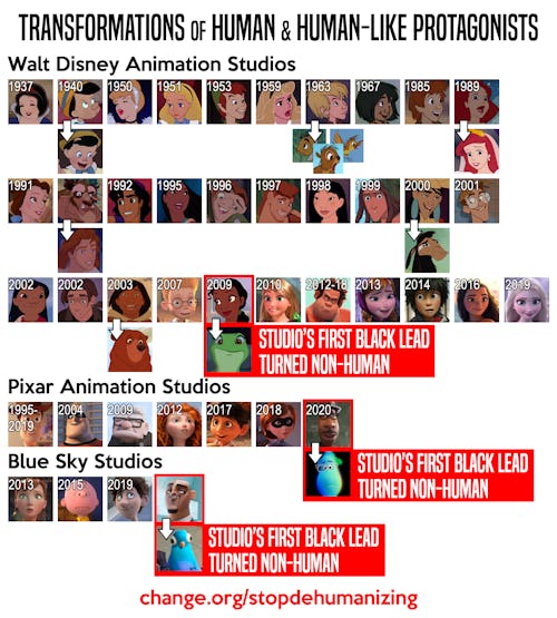In comparison, almost all of Disney, Pixar, and Blue Sky’s non-POC protagonists dating back to 1937 have remained as their human forms for the entirety of their films.
