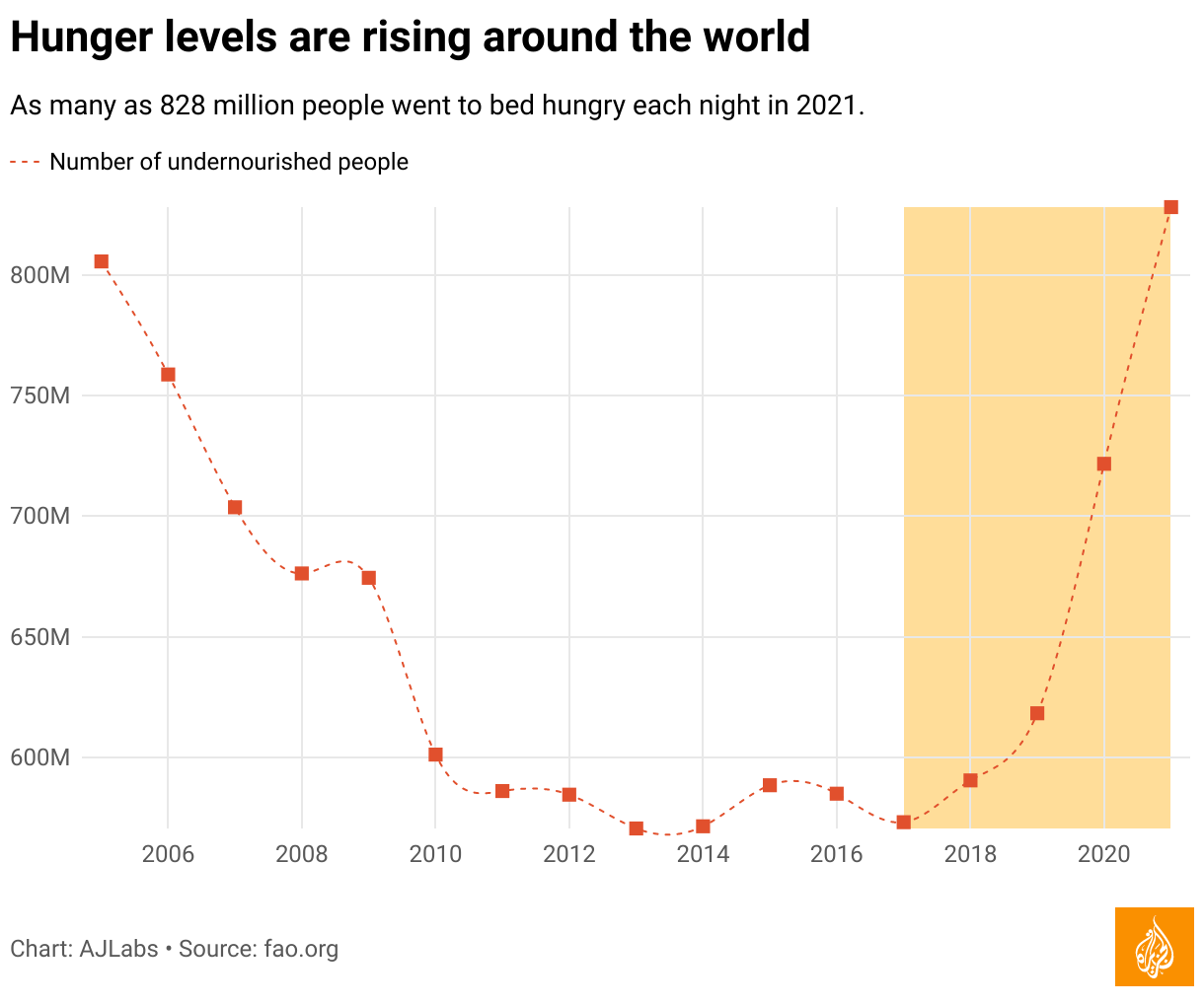 Following a decade of consistent decrease, global hunger has witnessed an upward trend in recent years. Between 2019 and 2021, the number of undernourished individuals increased by more than 150 million, primarily fuelled by conflicts, climate change, economic shocks and the COVID-19 pandemic.