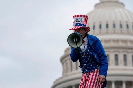 At first, when the rally began, the ersatz outfits seemed as if they were meant to be humorous. What better way for those in attendance to distinguish themselves from the Washington establishment they saw was the enemy (as they had been told by President Donald Trump) than to reject, in the most absurdly visual ways, the uniform of that establishment? In the Capitol building Nancy Pelosi may have been wearing a sapphire blue dress, and most senators and representatives may have been in dark suits, but on the streets the president’s supporters were leaving propriety behind. Some even left their shirts behind too (others wore message sweats telegraphing “Civil War”).