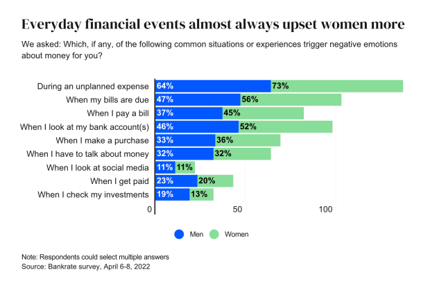 But while stressing about everything from paying the bills to having enough to pay for a child's education inevitably creeps up on even wealthy people, women are even more at risk of money-related stress. 46% of men and 36% of women said money worries negatively affected their mental health, a recent survey organized by Bankrate.com and sponsored by HealthLine Media found.