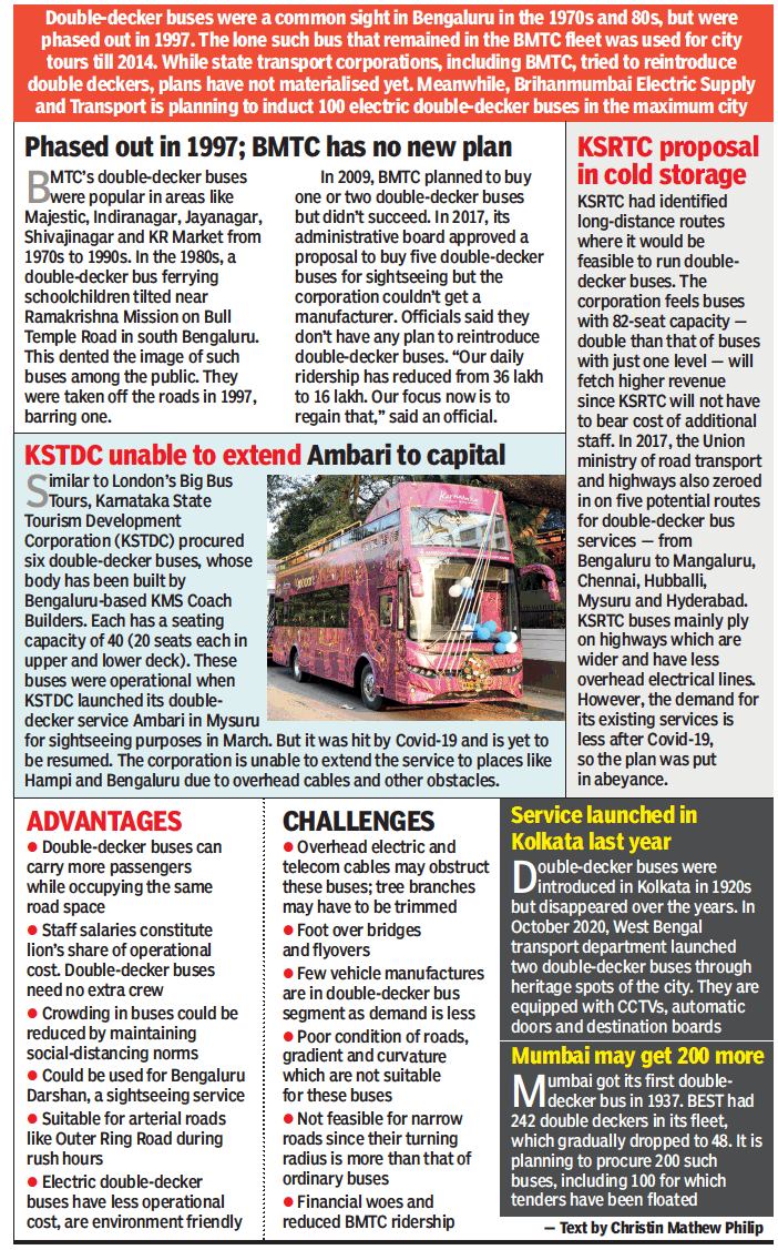 BENGALURU: Double-decker buses were a common sight on Bengaluru roads in the 1970s and 80s, but were phased out in 1997. The lone such bus that remained in the BMTC fleet was used for city tours till 2014. While state transport corporations, including BMTC, tried to reintroduce double deckers to bring back the nostalgia, plans have not materialised yet. However, Mumbai’s BEST (Brihanmumbai Electric Supply and Transport) is planning to induct 100 electric double-decker buses in the maximum city.