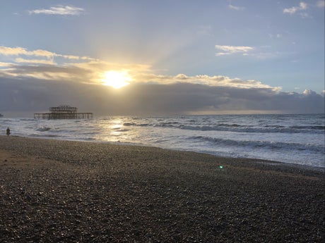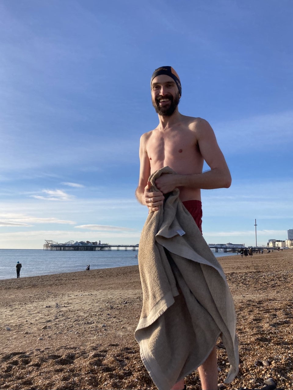 he pebbles of Kemptown beach slick with ice, I half crunch, half slide towards the water. The chill of a northerly breeze makes me shiver as I reach the shore line and look out towards Rampion Wind Farm on the horizon. The sea is calm, the waves lapping gently. The air temperature is around zero; the water is around 5C. It’s winter, and it’s time to go swimming.