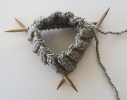Let’s try to understand the concept with knitting. One way of knitting objects that are round – like hats or gloves – is with special knitting needles called double pointed needles. While being made, the hat is shaped by three needles, making it look triangular. Then, once it comes off the needles, the stretchy yarn relaxes into a circle, making a much more typical hat.