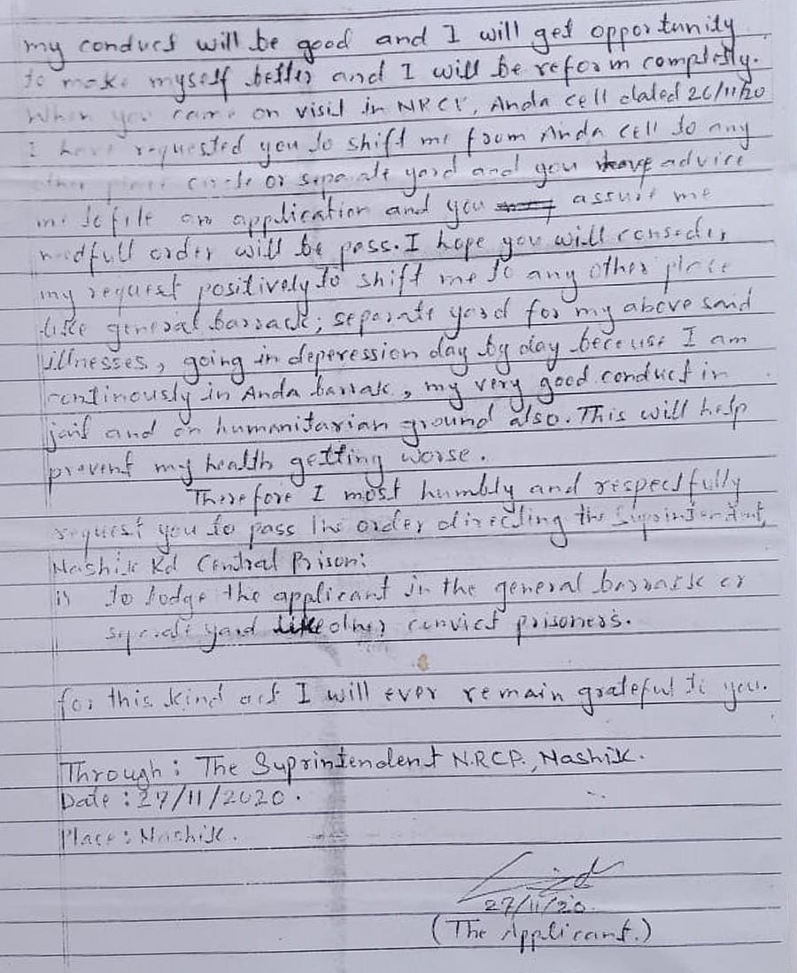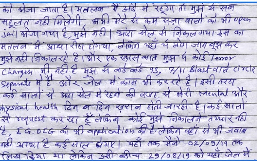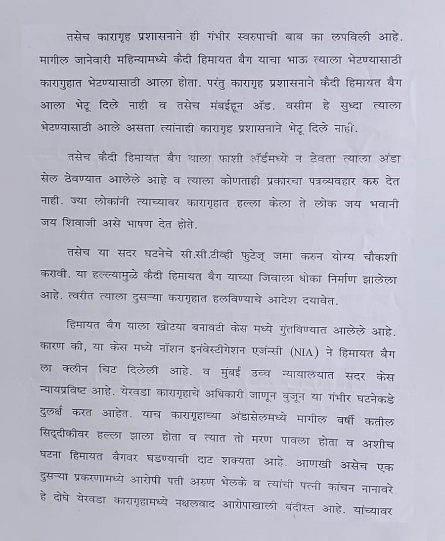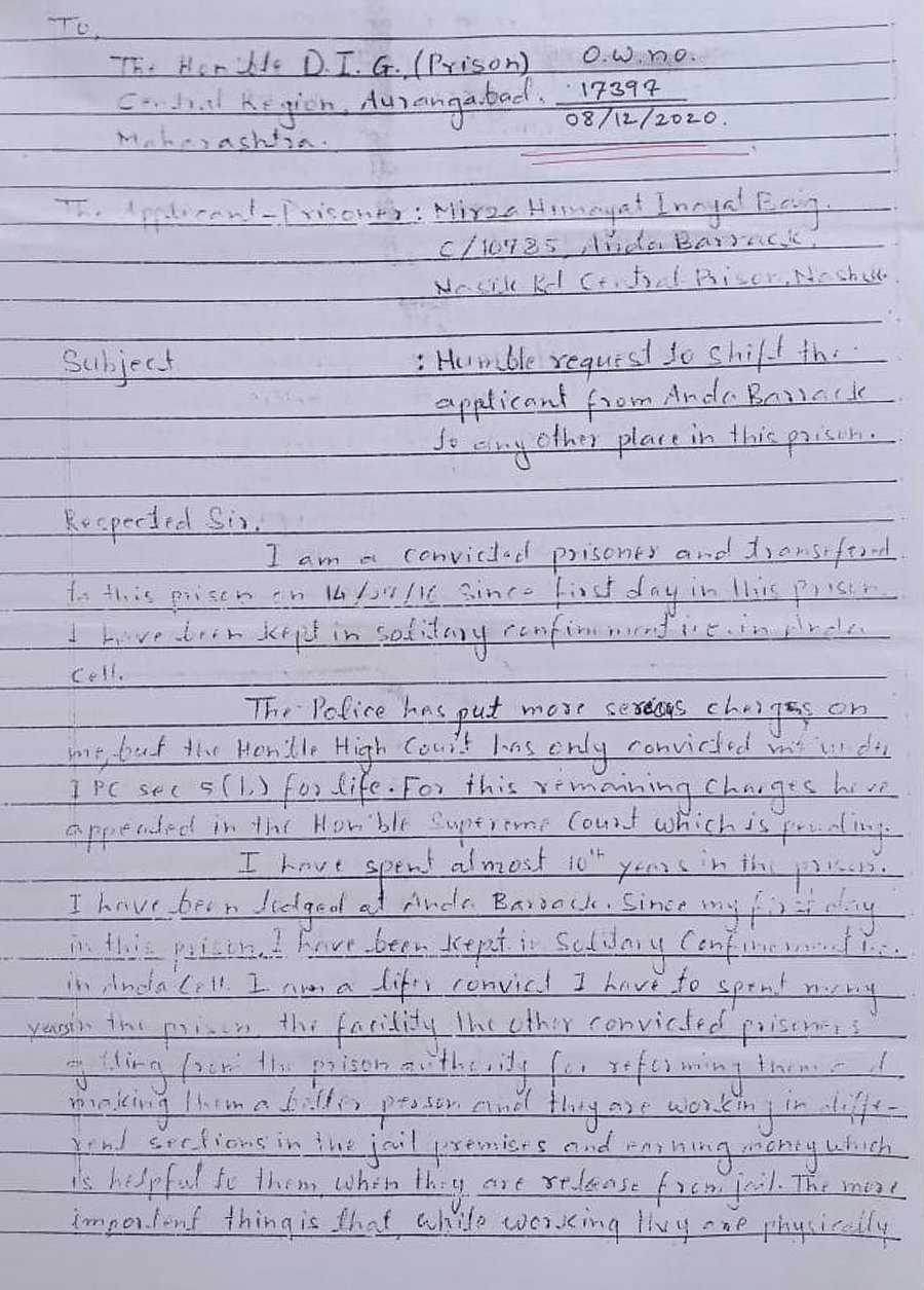 In 2019, Baig wrote a letter to his friend Abdul Rehan Ahmad detailing his ordeal in Anda Cell. He was being kept in solitary confinement despite having been acquitted on terror charges even as those convicted of orchestrating the 1993 Mumbai bombings were “staying in normal prison and working as well”. “I can’t sleep, my eyes have become weak and I have developed blood pressure,” he wrote, adding that he had been requesting the jail authorities to move him out of Anda Cell for many years, but to no avail.