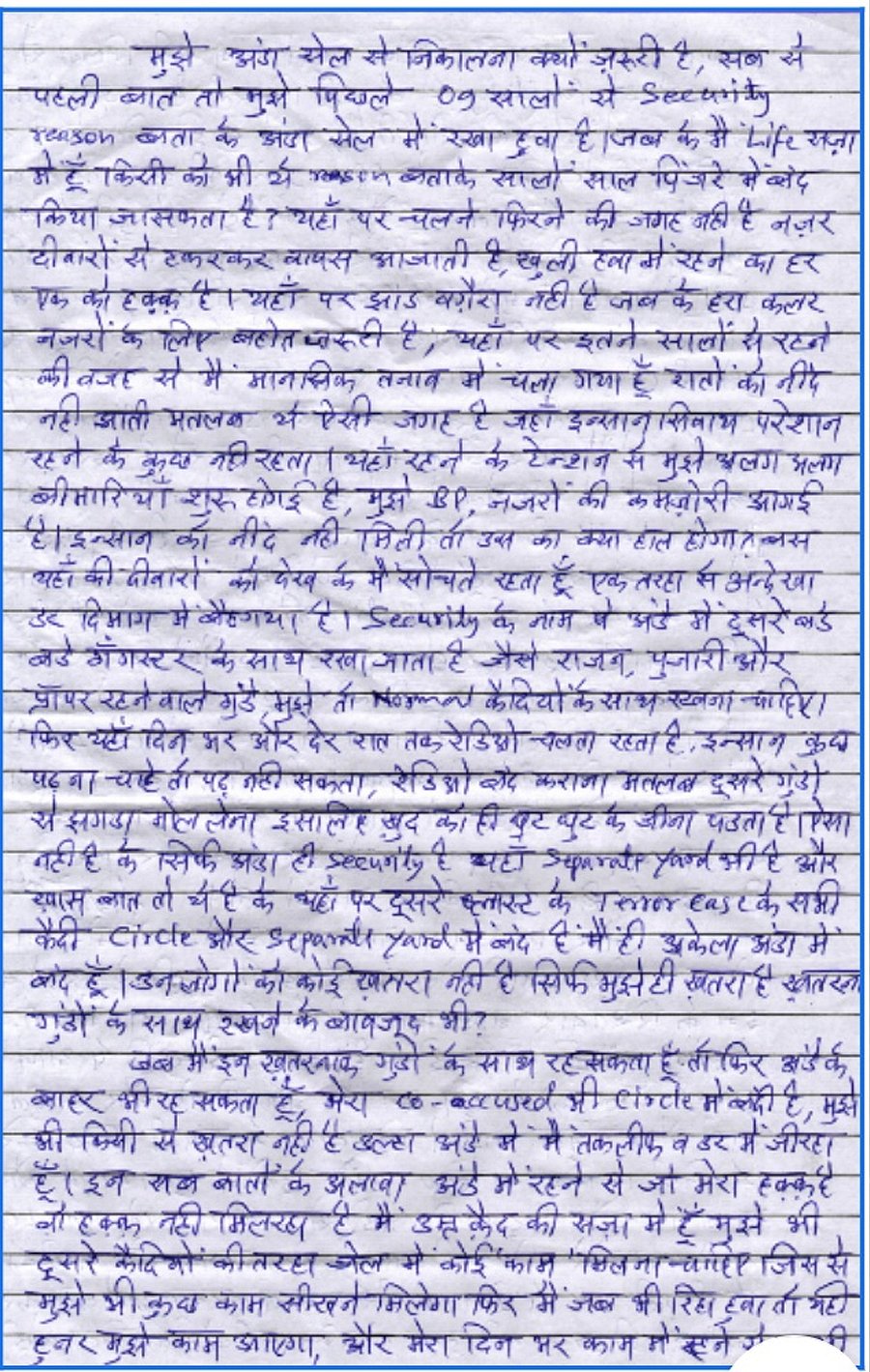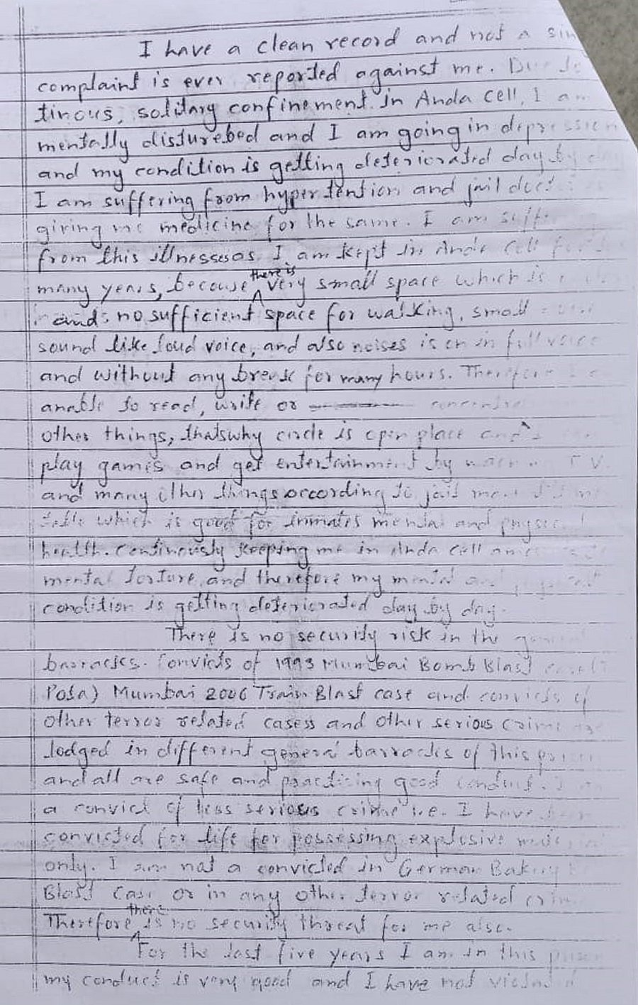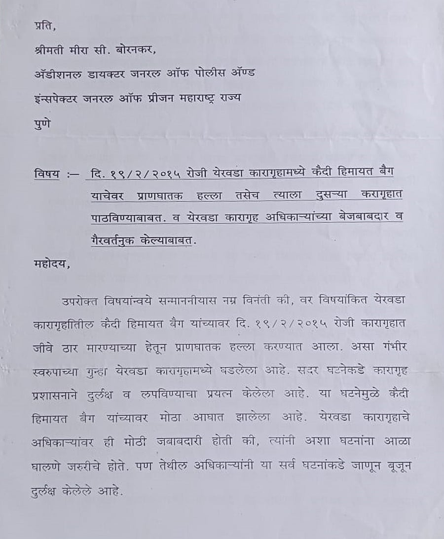 In 2019, Baig wrote a letter to his friend Abdul Rehan Ahmad detailing his ordeal in Anda Cell. He was being kept in solitary confinement despite having been acquitted on terror charges even as those convicted of orchestrating the 1993 Mumbai bombings were “staying in normal prison and working as well”. “I can’t sleep, my eyes have become weak and I have developed blood pressure,” he wrote, adding that he had been requesting the jail authorities to move him out of Anda Cell for many years, but to no avail.