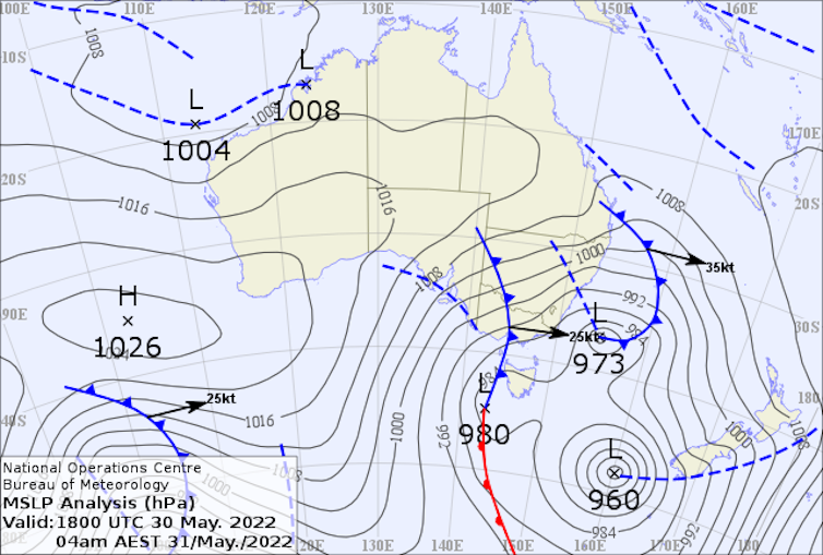 Air moves clockwise around low pressure systems in the Southern Hemisphere, so low pressure over Tasmania and the Tasman Sea means we have strong southerly and south-westerly winds over Victoria and New South Wales.