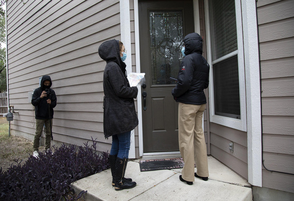 — Door No. 2: Alejandra Telles opened the door a crack and gratefully accepted the literature, complementing them on their civic mindedness on such a raw day. They reminded her to vote — that's their sole mission — without advising her how to vote.