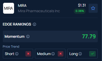 Mira Pharmaceuticals has gained 20% over the past year and 0.76% in the past month. On Wednesday, 3.7 million shares were traded, well above the stock's average daily volume of 661,120.