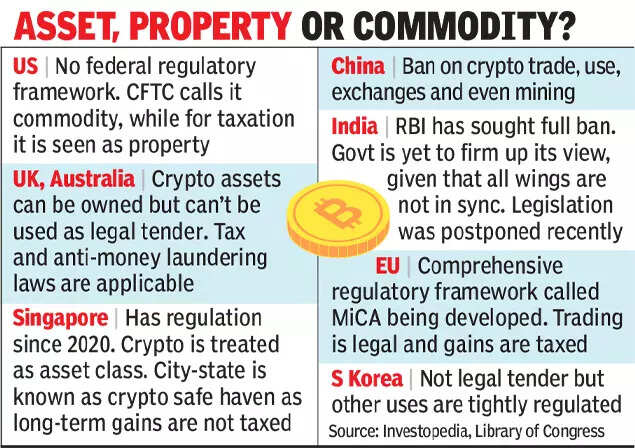 In the US, some states view crypto favourably, but there is no federal regulation. For taxation, crypto has been classified as ‘property’ since 2014. Derivatives regulator CFTC has said crypto is a ‘commodity’, while markets watchdog SEC has not made any definitive statements on treatment of crypto.