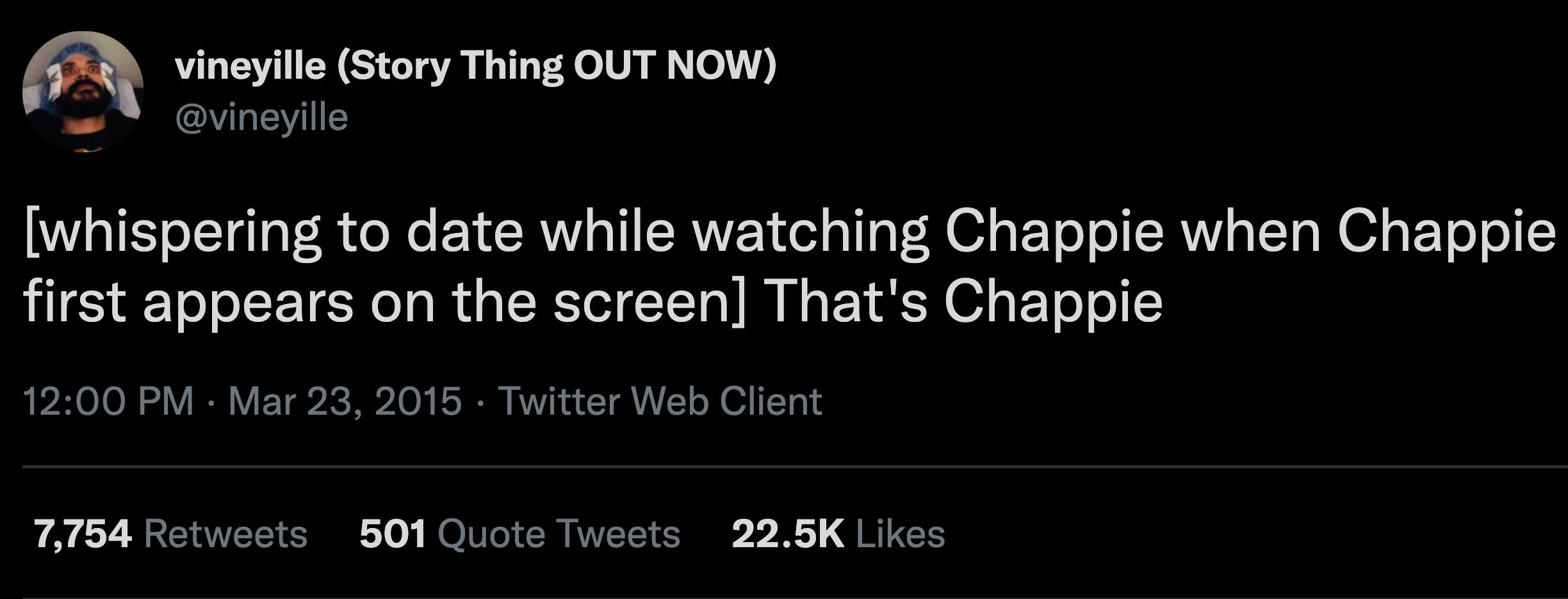When Chappie premiered in March 2015, the movie landed with a thud, mostly because the charming story of a robot that learns to think for itself couldn’t measure up to the director’s visceral sci-fi debut, District 9. But Chappie made history just a couple of weeks later when a clever joke went viral and turned the film into a Twitter mainstay.