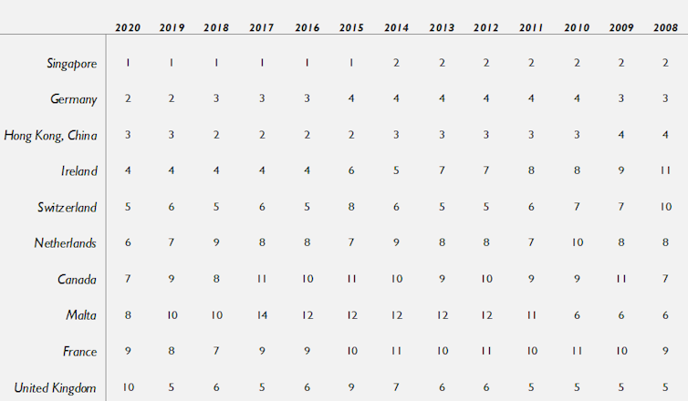 By some measures, the UK is a highly rated investment destination. Other measures tell investors and companies how easy it is to do business in a country. For example, China’s World Openness Index, which measures cross-border economic, social and cultural factors, ranked the UK tenth in 2020 (its latest report) – although this was down from fifth in 2008.