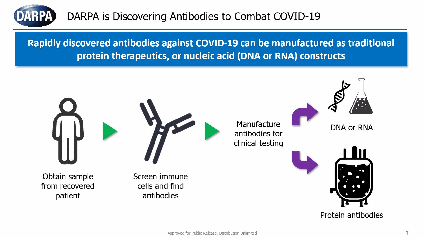 Researchers at DARPA and elsewhere are working under a timeline crunch to get safe and effective treatments out the door. Finding and manufacturing antibodies is a process that can take years — but in dealing with Covid-19, researchers have managed to get it down to 90 days, says DARPA’s Jenkins.