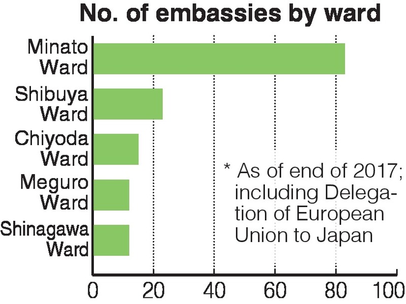 According to the Foreign Ministry, 155 countries, including the Delegation of the European Union to Japan, had embassies in this nation as of the end of last year. Of them, 83 embassy facilities are located in the ward, far more than the 23 embassies in Shibuya Ward, which ranked second.