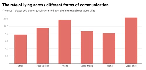 There are several possible explanations for these results, though more work is needed to understand exactly why different media lead to different lying rates. It’s possible that certain media are better facilitators of deception than others. Some media — the phone, video chat — might make deception feel easier or less costly to a social relationship if caught.