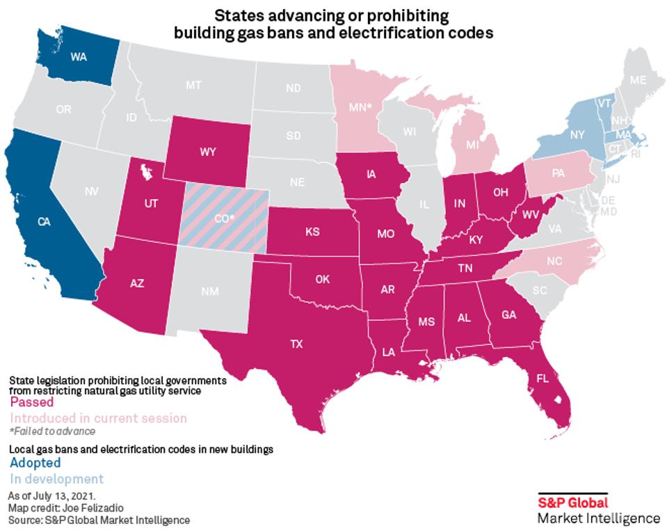 Thus far, 19 states have enacted legislation that preempts local regulations banning natural gas hookups in new construction. “Those states accounted for nearly one-third of U.S. residential and commercial gas consumption in 2019,” S&P Global reports. “Some of the biggest consumers — Ohio, Texas and Indiana — have passed such laws in recent months.”