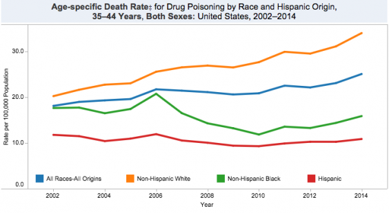 In 2014, white Americans between the age of 25-34 were dying by overdose at a rate that's roughly three times what it was in 2002, while the death rate for black Americans and Hispanics went relatively unchanged over that 12-year period.