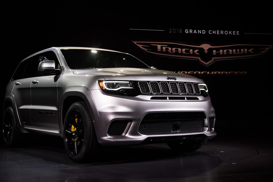 Think of it as a Ferrari that can carpool, carry up to 68.3 cubic feet of stowage, and tow up to 7,200 pounds. The new-for-2018 Trackhawk version of the popular Jeep Grand Cherokee SUV packs the 6.2-liter 707-horsepower supercharged V8 engine that otherwise resides under the hoods of the Dodge Challenger and Charger Hellcat models and, along with suspension and other performance-minded enhancements, imbues the popular people mover with abilities that leaves mere mortal SUVs in its dust.