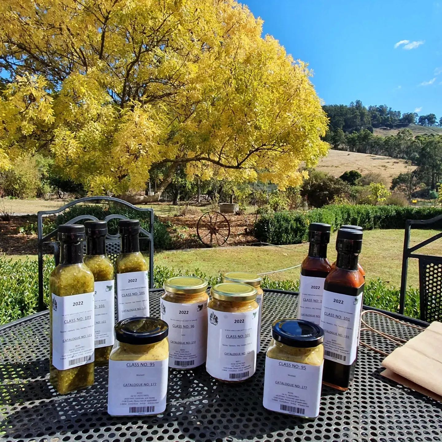 The talented cook's Gold Aztec Green Hot Sauce made from farm-grown tomatillos, Zucchini Sweet Mustard Relish made with farm-grown zucchinis, De-Vinely Red Tomato Sauce and Coriander Honey Mustard won gold, silver and bronze at the 2022 Royal Tasmanian Fine Food Awards.