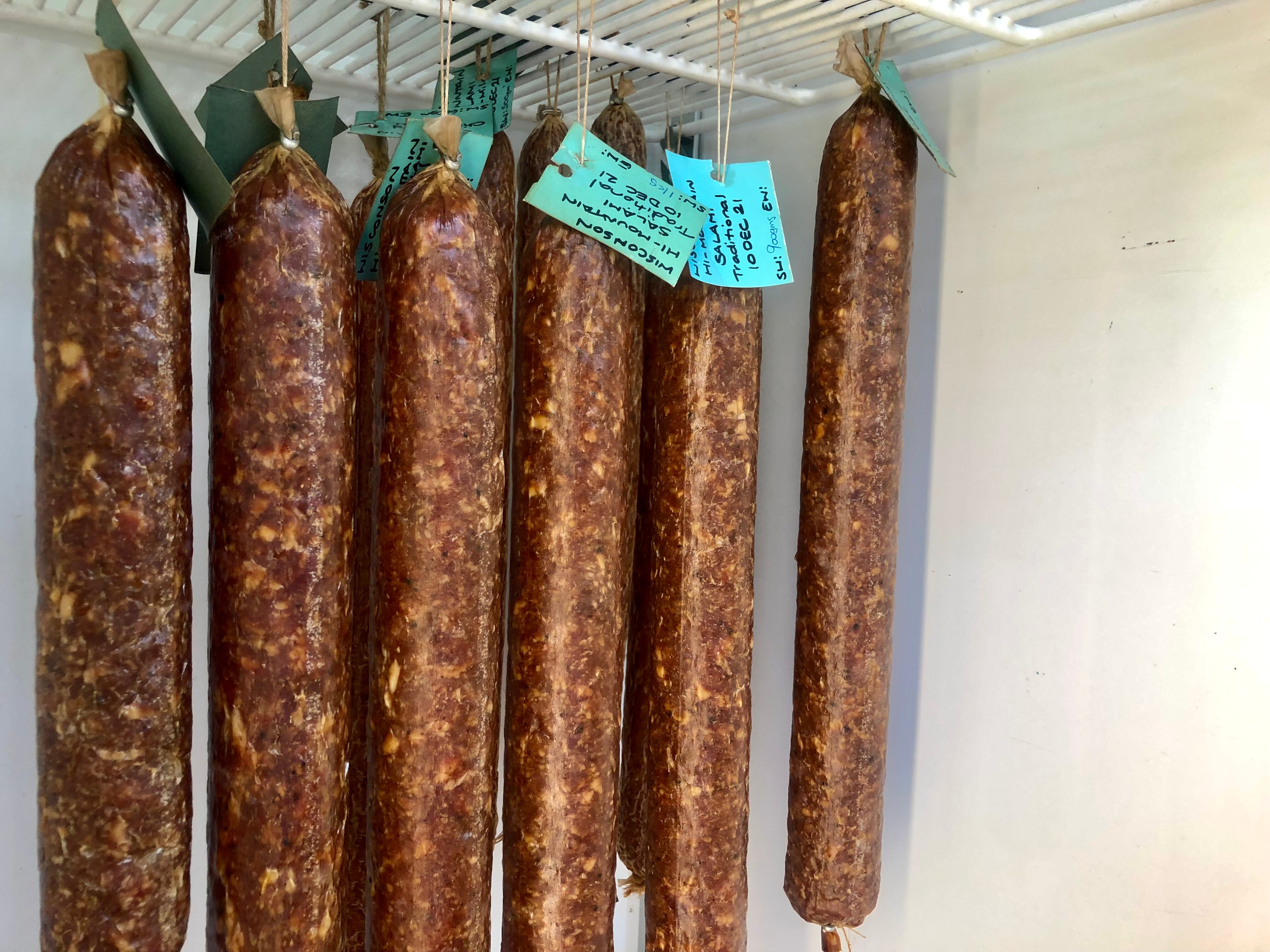 This month marks a year since the couple made their tree change and their farm's fridges are already filled with curing ham, salamis, cheesy cabanas and prosciutto.