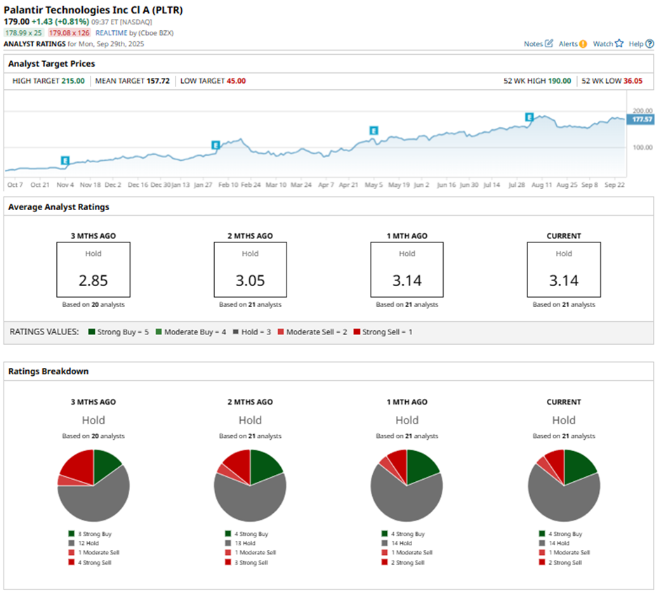 PLTR stock has a consensus rating of a “Hold" overall. Of the 21 analysts covering the stock, four advise a “Strong Buy,” 14 suggest a “Hold,” one analyst gives it a “Moderate Sell” rating, and two rate it as a “Strong Sell.”