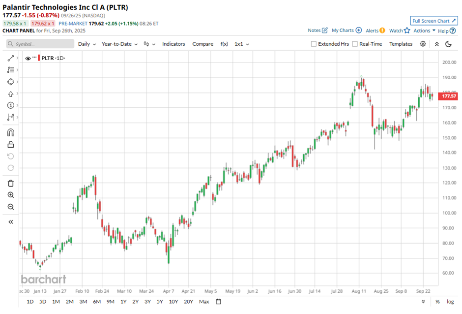 In 2025 alone, PLTR stock has climbed 145% on a year-to-date (YTD) basis, significantly outpacing major indices like the S&P 500 Index ($SPX), which has delivered around 15% returns over the same period. The stock recently touched a 52-week high of $190 on Aug. 12.