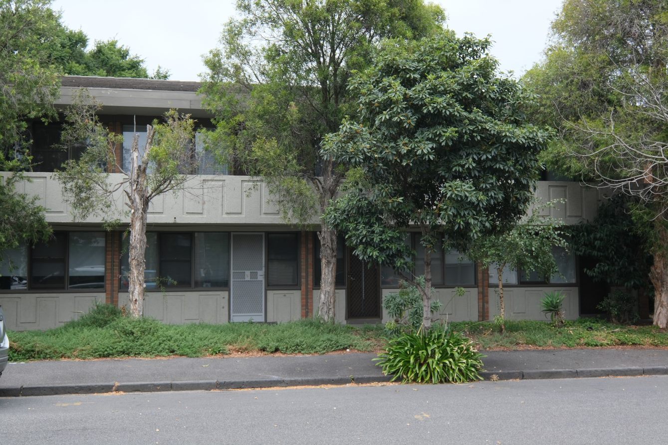 The two-storey complex sits between terrace and townhouses and a church, with leafy trees and pot plants dotted across its front yard.