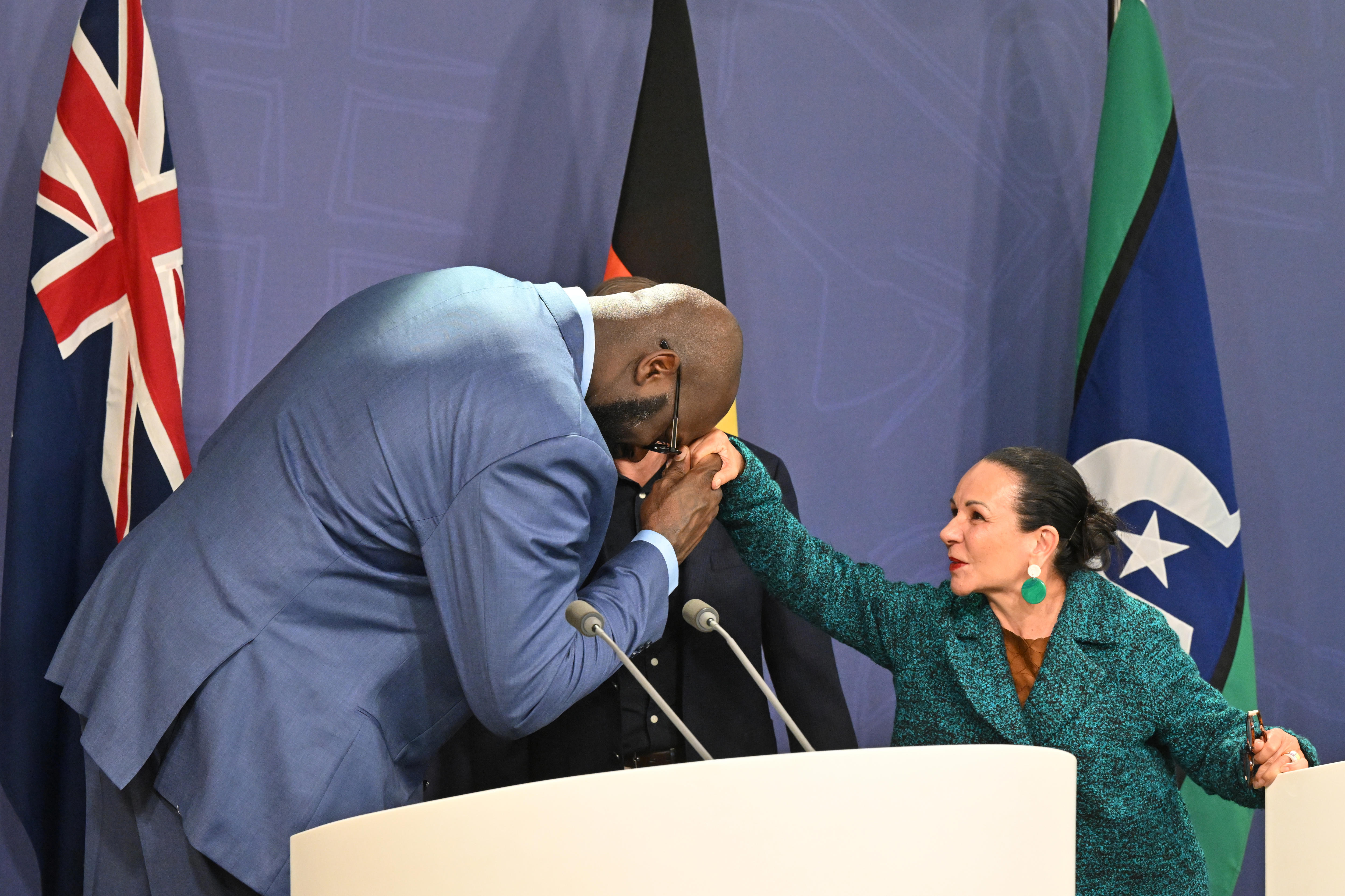 Mr Albanese gave O'Neal two jerseys from his favourite rugby league team, the South Sydney Rabbitohs, and Ms Burney gave him a boomerang handmade by First Nations artist Josh Evans.