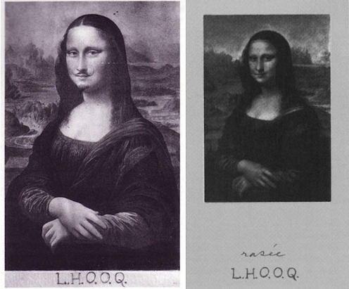 Can you spot the difference between these two images? They are both by French conceptual artist Marcel Duchamp. On the left is L.H.O.O.Q. (1919) where Duchamp drew a moustache and beard on the picture of Mona Lisa. You may wonder about the acronym he chose as a title for this. If you pronounce the letters in French, what you get sounds like “Elle a chaud au cul” (my humble translation: “She’s horny”).
