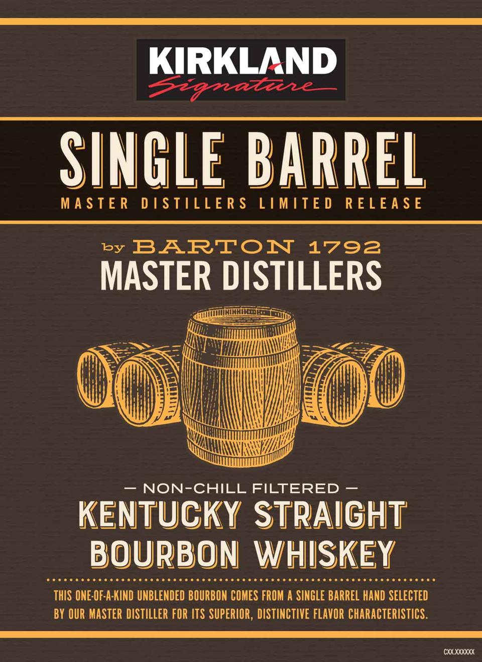 Kirkland Signature, Single Barrel, Barton 1792 Master Distillers, Non-Chill Filtered, Kentucky Straight Bourbon Whiskey, NAS, 60% ABV, 1 liter