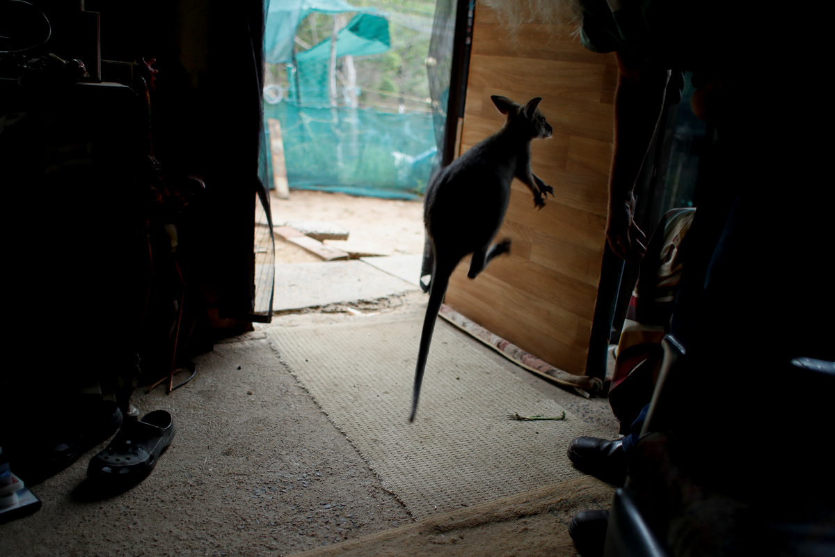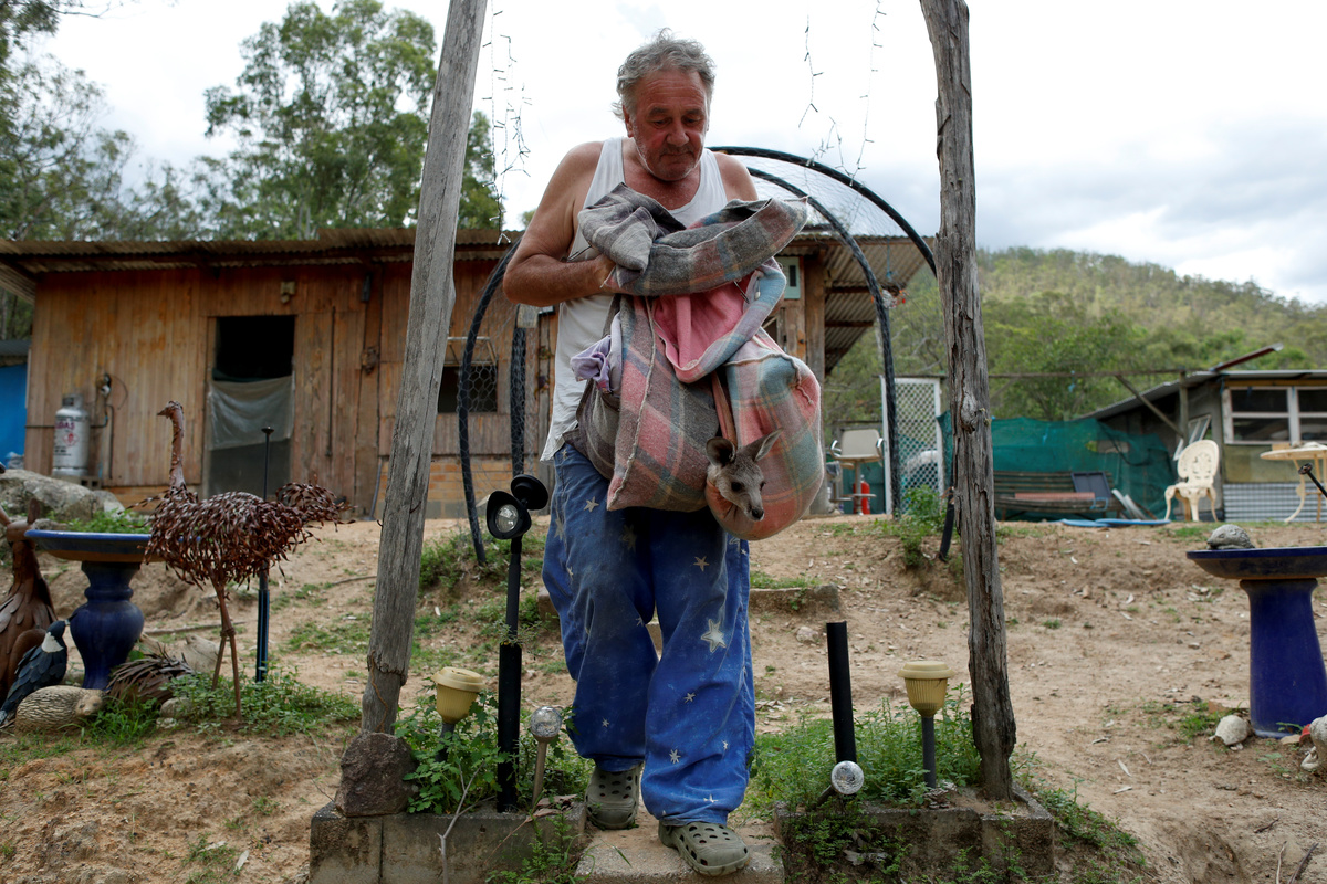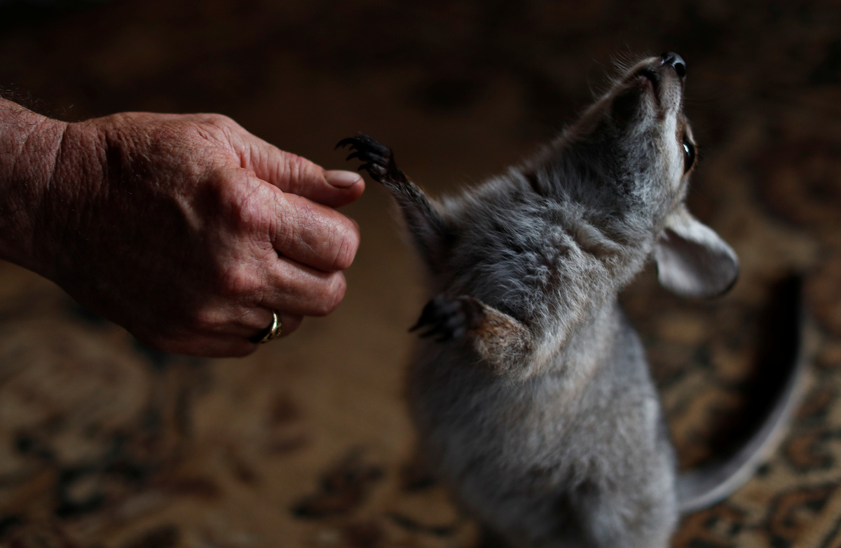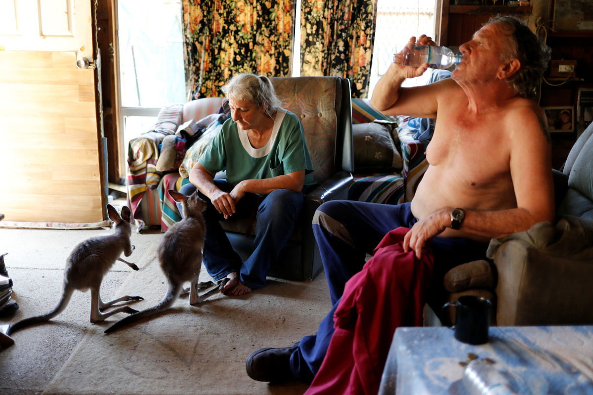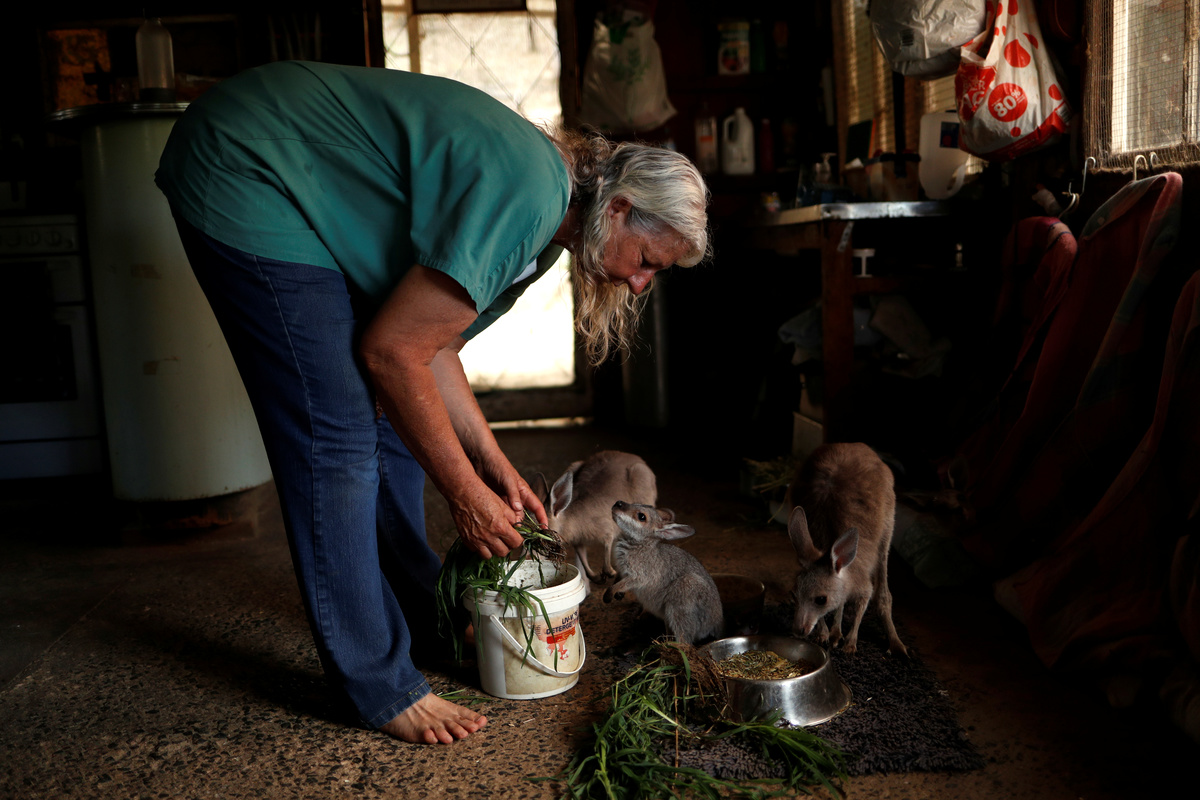 Julie Willis, an animal carer, feeds orphaned kangaroo joeys that were rescued during the bushfire season, in the living room of her home in the community of Wytaliba, New South Wales, Australia January 28, 2020. REUTERS/Jorge Silva Julie Willis, an animal carer, carries an orphaned kangaroo joey that was rescued during the bushfire season, in the living room of her home in the community of Wytaliba, New South Wales, Australia January 27, 2020. REUTERS/Jorge Silva An orphaned kangaroo joey that was rescued during the bushfire season, plays with Gary Wilson, an animal carer, in the living room of his home in the community of Wytaliba, New South Wales, Australia January 27, 2020. REUTERS/Jorge Silva Partners Gary Wilson and Julie Willis, both of whom are animal carers, have lunch at their home in the community of Wytaliba, New South Wales, Australia January 28, 2020. REUTERS/Jorge Silva Julie Willis, an animal carer, feeds orphaned kangaroo joeys that were rescued during the bushfire season, in the living room of her home, in the community of Wytaliba, New South Wales, Australia January 28, 2020. REUTERS/Jorge Silva An orphaned kangaroo joey that was rescued during the bushfire season, jumps inside the living room of partners Gary Wilson and Julie Willis's home, both of whom are animal carers, in the community of Wytaliba, New South Wales, Australia January 28, 2020. REUTERS/Jorge Silva Partners Gary Wilson and Julie Willis, both of whom are animal carers, sit in their living room of their home in the community of Wytaliba, New South Wales, Australia January 28, 2020. REUTERS/Jorge Silva Orphaned kangaroo joeys that were rescued during the bushfire season, sit in cloth pouches hung in the the living room of partners Gary Wilson and Julie Willis's home, both of whom are animal carers, in the community of Wytaliba, New South Wales, Australia January 28, 2020. REUTERS/Jorge Silva Gary Wilson, an animal carer, carries orphaned kangaroo joeys that were rescued during the bushfire season, outside his home in the community of Wytaliba, New South Wales, Australia January 29, 2020. REUTERS/Jorge Silva Partners Gary Wilson and Julie Willis, both of whom are animal carers, collect sand bags used to protect homes from the rain, in the community of Wytaliba, New South Wales, Australia January 28, 2020. REUTERS/Jorge Silva A kangaroo who sustained burn wounds during the bushfire season, stands in the backyard of partners Julie Willis and Gary Wilson's home, both of whom are animal carers, in the community of Wytaliba, New South Wales, Australia January 27, 2020. REUTERS/Jorge Silva A kangaroo joey hangs from its mother's pouch, outside partners Gary Wilson and Julie Willis's home, both of whom are animal carers, in the community of Wytaliba, New South Wales, Australia January 28, 2020. REUTERS/Jorge Silva Partners Gary Wilson and Julie Willis, both of whom are animal carers, chat outside their home in the community of Wytaliba, New South Wales, Australia January 28, 2020. REUTERS/Jorge Silva Julie Willis, an animal carer, feeds orphaned kangaroo joeys, in an area of her home designated for the pre-release of kangaroos, in the community of Wytaliba, New South Wales, Australia January 28, 2020. REUTERS/Jorge Silva An orphaned kangaroo joey that was rescued during the bushfire season, stands in the living room of partners Gary Wilson and Julie Willis's home, both of whom are animal carers, in the community of Wytaliba, New South Wales, Australia January 28, 2020. REUTERS/Jorge Silva A kangaroo stands in front of the remains of a burnt down house, destroyed during the bushfire season, in the community of Wytaliba, New South Wales, Australia January 29, 2020. REUTERS/Jorge Silva The remains of cars that were burnt during the bushfire season, are piled up in the community of Wytaliba, New South Wales, Australia January 27, 2020. REUTERS/Jorge Silva